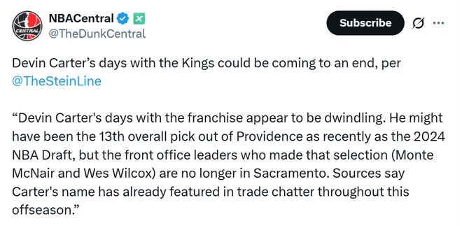 Marc Stein说道:联盟消息人士透露,尽管德文·卡特在2024年选秀时高居第13顺位,但当初做出这一选择的总经理蒙蒂·麦克奈尔和韦斯·威尔考克斯已离开萨克拉门托。据悉,卡特的名字已频繁出现在今年休赛期的交易流言中,他在国王的日子可能即将结束。