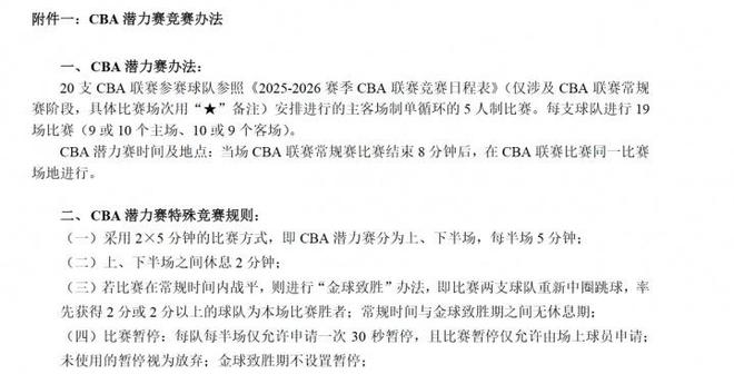 北京时间11月17日,2025-2026赛季CBA常规赛进行改革,比赛时间变为每节10分钟。为给本土球员增加比赛锻炼机会,如今CBA推出新规增加CBA潜力赛,分别上下半场各5分钟,加时采取金球致胜,只能是非首发国内球员参赛,其中CBA潜力赛成绩特定情况下将影响到CBA常规赛的排名。