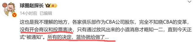 另外球圈赵探长也表示:“这也是我不理解的地方,各家俱乐部作为CBA公司股东,完全不知晓CBA的变革,没有开会商议和投票表决,只有通过放风出来的小道消息才略知一二,直到11月17日正式“被通知”。所有的决定,都是篮协直接就给做了。”