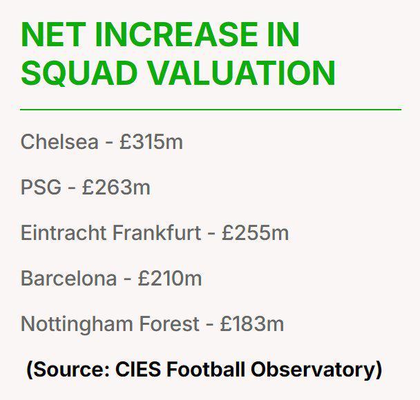 切尔西这几年狂买年轻人的转会策略起初遭到广泛嘲笑,但近期风评明显转好。按照“足球天文台”估算,世界范围内,切尔西是过去一年中,阵容升值幅度最大的俱乐部,增幅达3.15亿英镑。排在蓝军身后的是巴黎(2.63亿)、法兰克福(2.55亿)、巴萨(2.1亿)、诺丁汉森林(1.83亿)。不仅如此,该机构的统计还将切尔西列为阵容身价之最,达到15.6亿镑,皇马(14.6亿)、曼城(12.8亿)等豪门都要靠后站。蓝军获得如此高看,显然与该队今夏拿到世俱杯冠军有着直接关系。